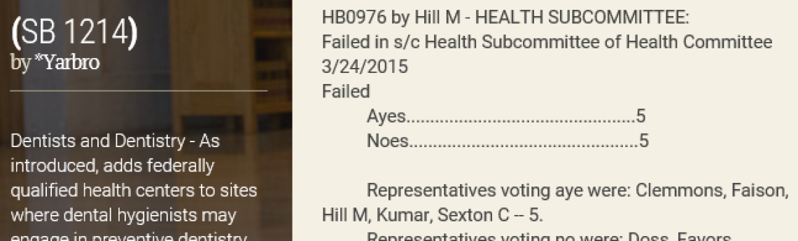 Disappointing Vote on House Bill 0976 Denies Poor and Disadvantaged Patients Preventive Dental Hygiene House Floor and Committee Votes HB0976 by Hill M – HEALTH SUBCOMMITTEE: Failed in s/c Health Subcommittee of Health Committee 3/24/2015 Failed Ayes…………………………………………5 Noes…………………………………………5 Representatives voting aye were: Clemmons, Faison, Hill M, Kumar, Sexton […]